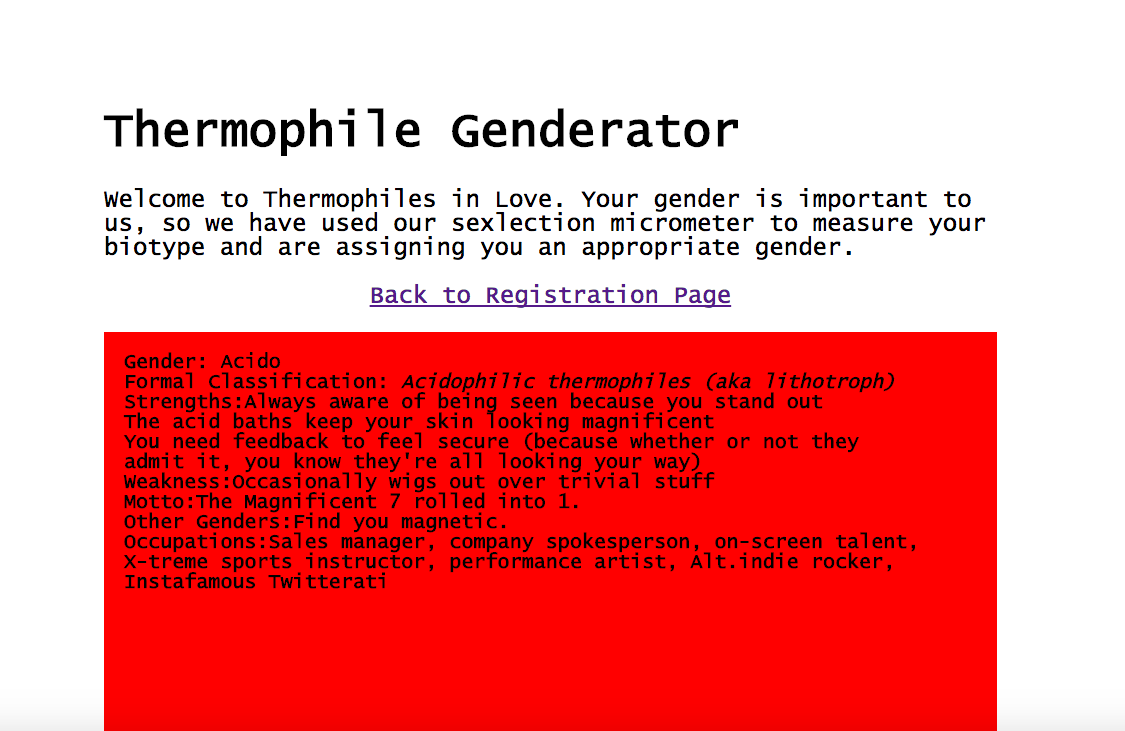 Thermophiles in Love (2016) is a transmedia piece centering a 5-gender dating game that incorporates biological data about microorganisms in a playful critique of gender bio-essentialism. Its creators are Samara Hayley Steele, Mark Marino, Rob Wittig, and Cathy Podeszwa. TiL includes a larp, a netprov, and an interactive gallery display. The larpscript was written by Samara Hayley Steele. The netprov was produced by Meanwhile Netprov Studios, and ran from October 21st – November 6th, 2016.