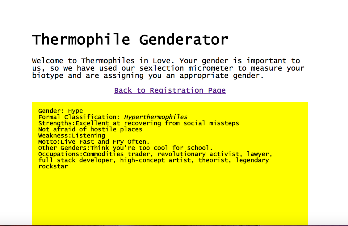The netprov took the form of a 5-gender dating website, as well as discussion boards for thermophiles to work through relationship issues.